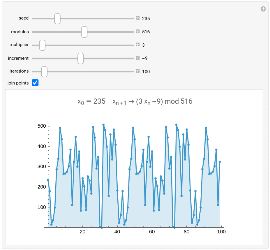 - Useful demo here: https://demonstrations.wolfram.com/LinearCongruentialGenerators.